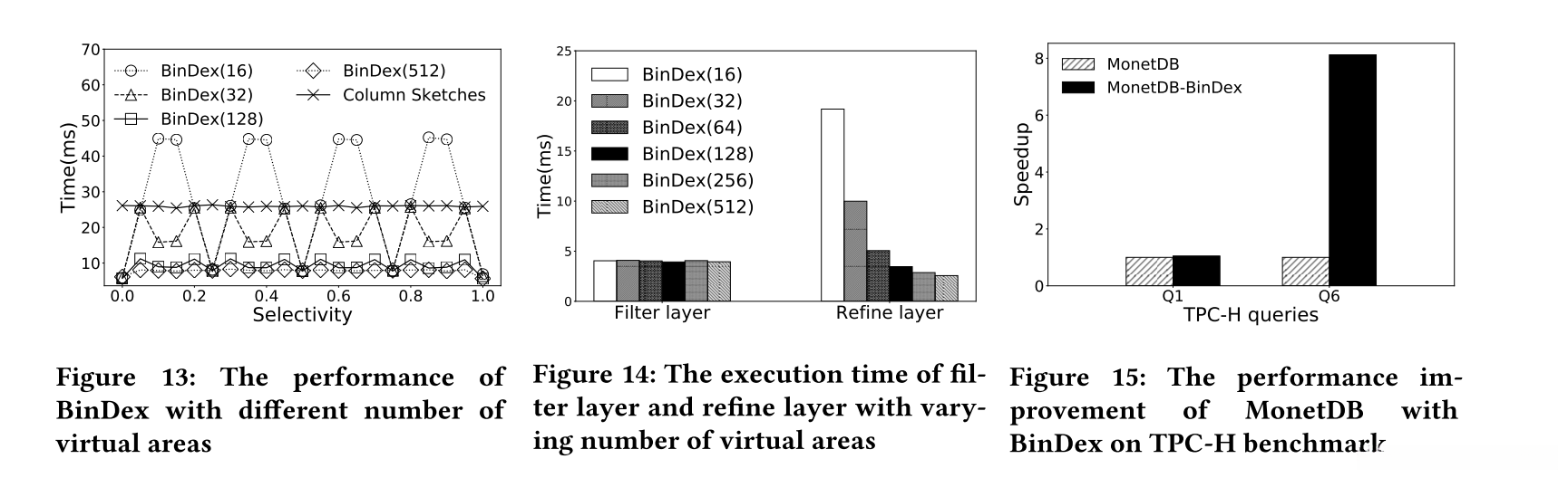 图15比较了BinDex带来的性能提升。在TPC-H测试集上,与原始的MonetDB相比,使用BinDex的MonetDB在Q1和Q6上分别取得了4.9%和7.1倍的性能提升。由于Q1的大部分查询执行时间花费在执行聚合上,因此其性能提升并不明显。相比之下,对于Q6,更多的时间花在执行扫描上,因此有更高的性能提升。