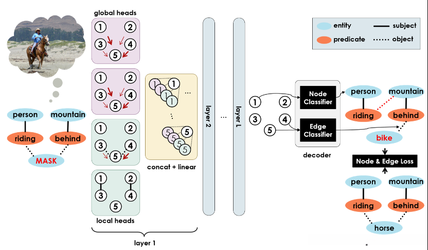 为此,我们首先提出了视觉常识的数学形式化,作为自动编码摄动场景图的问题。基于新形式主义,我们提出了一种从附加注释的场景图中学习视觉常识的新方法。我们扩展了最近成功的变压器[23]通过添加局部注意力头,使他们能够编码场景图的结构,并在注释场景图的语料库上训练他们,通过类似于BERT的掩码框架预测场景缺失的元素[5]。如图2所示,考虑到给定场景图的结构和上下文,我们的常识模型学会了利用其经验来想象哪个实体或谓词可以取代掩码。一旦训练好,它可以堆叠在任何感知(即SGG)模型上,以纠正生成的场景图中的荒谬错误。