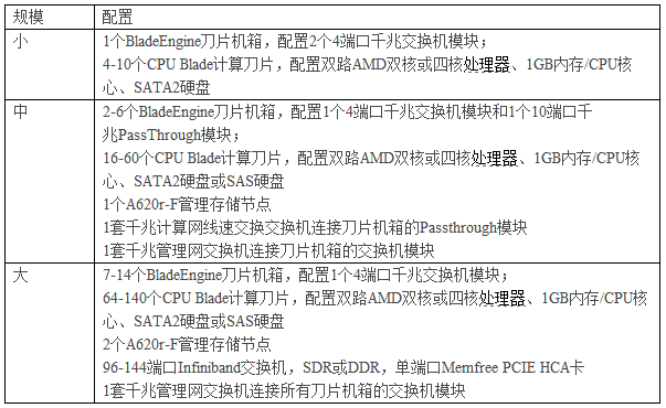 我们以大、中、小三种规模Prepare了3套基于TC2600刀片服务器的集群方案,并可供用户选择:
