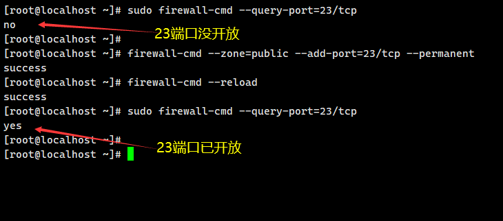 sudo firewall-cmd --query-port=23/tcp