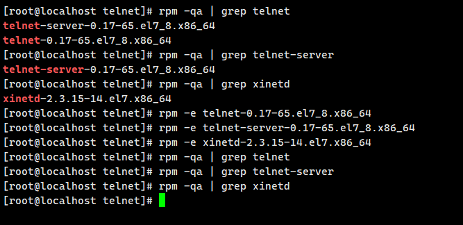 rpm -e telnet-0.17-65.el7_8.x86_64