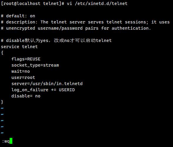vi /etc/xinetd.d/telnet