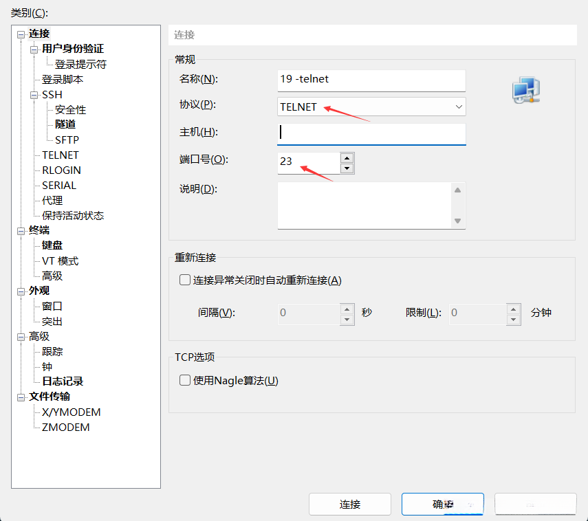 这里我们使用软件Xshell,协议选择TELNET 连接服务器。
