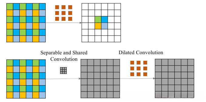 图2.插图[37]中的膨胀卷积和拟议的平滑膨胀卷积的网格化伪影:下一层i的四个不同点用不同的颜色表示,可以看出它们与完全不同的单元集有关 可能会导致网格化伪影。 相比之下,平滑的扩张卷积在扩张卷积之前在输入单元之间增加了额外的可分离和共享卷积层。