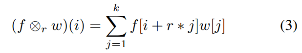 其中r是扩张率,当r = 1时,扩张卷积将退化为规则卷积。要直观地理解扩张卷积,我们可以将其视为在w的两个相邻权重之间插入r-1个零。 这样,扩张的卷积可以将原始接收场从k增加到r ∗(k-1)+1,而不会降低分辨率。