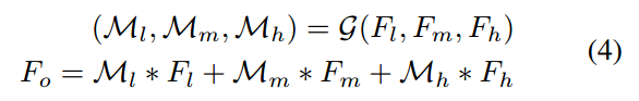 门控融合子网 : 如[27,42]所示,将不同级别的功能融合通常对于低级和高级任务都是有益的。 为了实现这个想法,[27]使用特征金字塔在所有尺度上融合了高级语义特征图,[42]则利用了密集连接的网络。 在本文中,我们通过合并额外的门控融合子网G采用不同的方式。具体来说,我们首先从不同级别Fl中提取特征图; 调频; Fh,并将其馈入门控融合子网。 门控融合子网的输出是三个不同的重要权重(M1,Mm,Mh),分别对应于每个特征级别。 最后,这三个特征图F1; 调频; 来自不同级别的Fh与回归的重要权重线性组合。