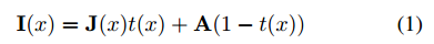 其中,I(x)和J(x)分别是退化的模糊图像和目标无雾场景的辐射度。 A是全球大气光,t(x)是介质透射图,该图取决于未知的深度信息。 先前的大多数除雾方法都首先估计透射图t(x)或大气光A,然后尝试恢复最终的干净图像J(x)。 但是第一步是一个非常具有挑战性的问题,因为在实际情况下,透射图t(x)和大气光A常常是未知的。