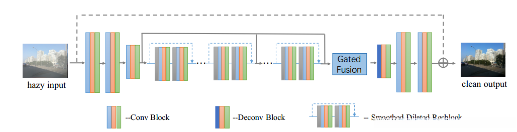 - 我们提出了一种新的用于图像去雾的端到端门控上下文聚合网络GCANet,其中使用平滑的扩张卷积避免网格化伪影,并使用门控子网融合不同级别的特征。