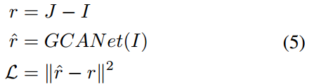 其中r和r ^分别是地面实况和预测的霾残留量。 在期间,我们将r ^添加到输入的模糊图像上,以获得最终的预测无雾图像。需要强调的是,设计更好的损耗函数不是本文的重点,但是我们提出的GCANet应该能够推广到设计更好的损耗。 例如,[24,42,44]发现知觉损失[20],而GAN损失可以改善最终的除雾效果。 但是,即使仅具有上述简单的损失,我们的方法仍然可以达到最新的性能。