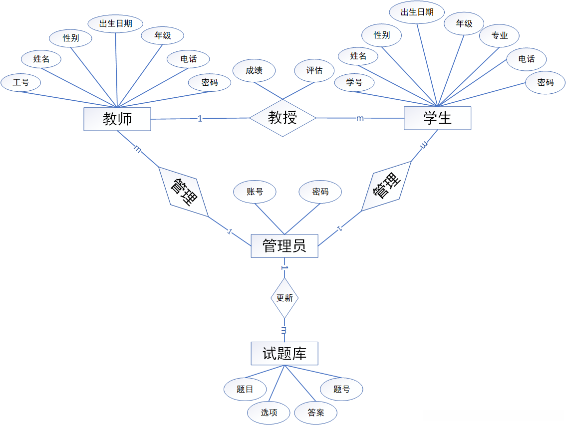 绘制E-R图的核心目标是准确地将现实中的数据转换为关系数据库中的数据模型/模式的图形化表示方式。其重要性体现在它是构建关系数据库的重要工具。基于对学生心理系统的理解,绘制E-R图相对容易。整体结构如下: