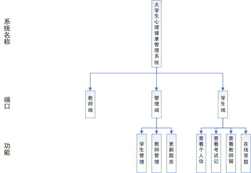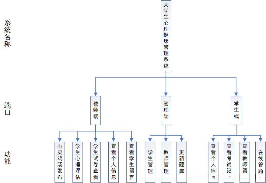 管理员可通过系统登录界面完成信息的新增、删除及修改等更新操作;心理辅导师具备对学生心理状态进行评估、在线交流回复以及进行跟踪辅导的能力;学生可通过网络平台查阅心灵鸡汤文章、提交心理评估试卷以及参与在线咨询。