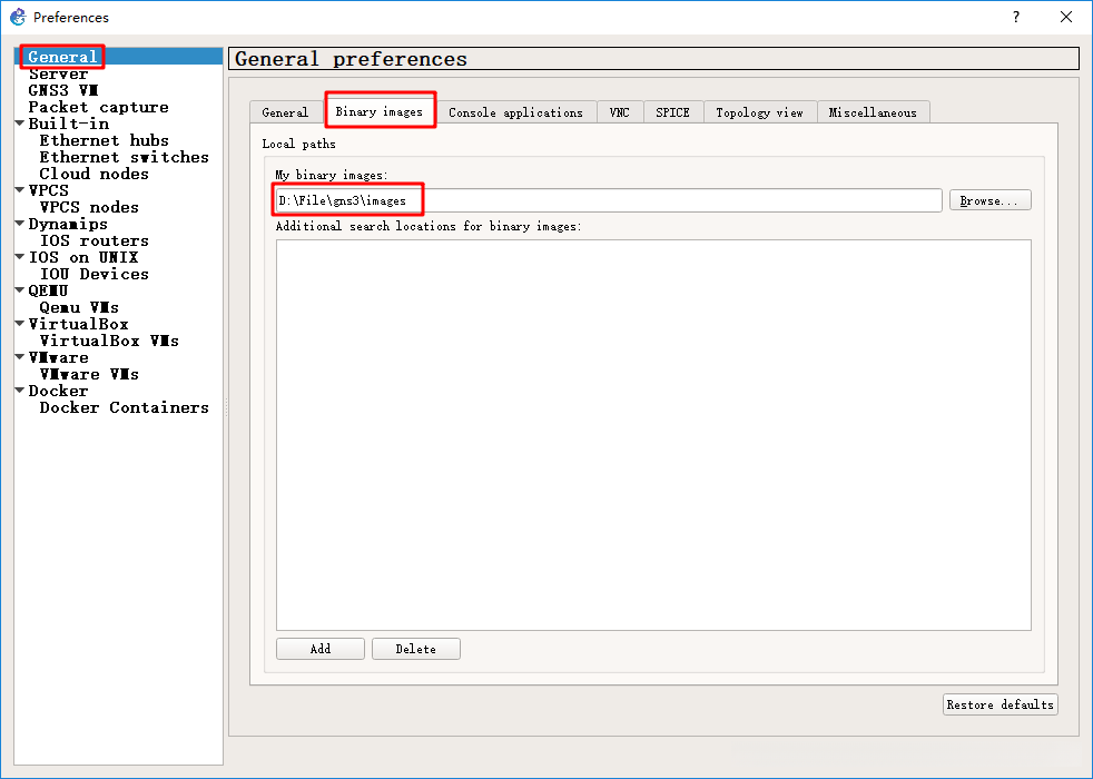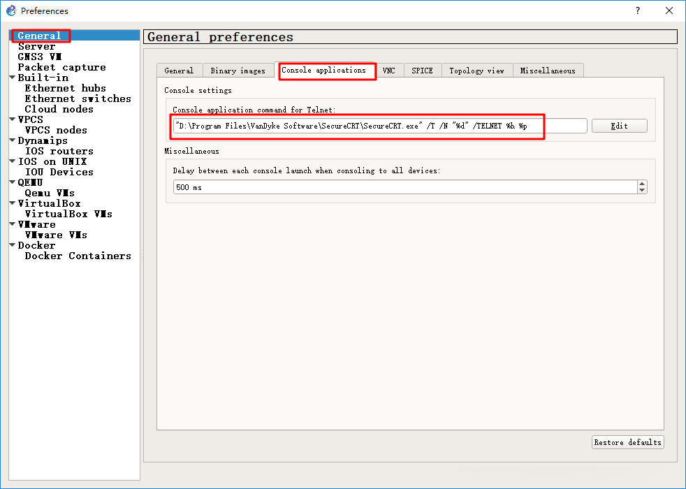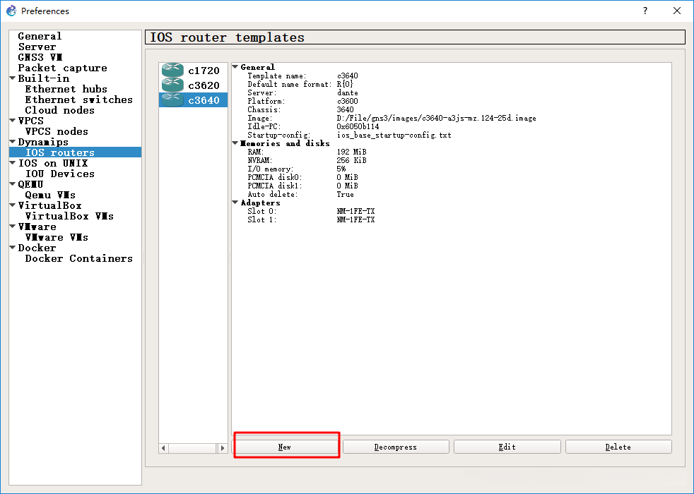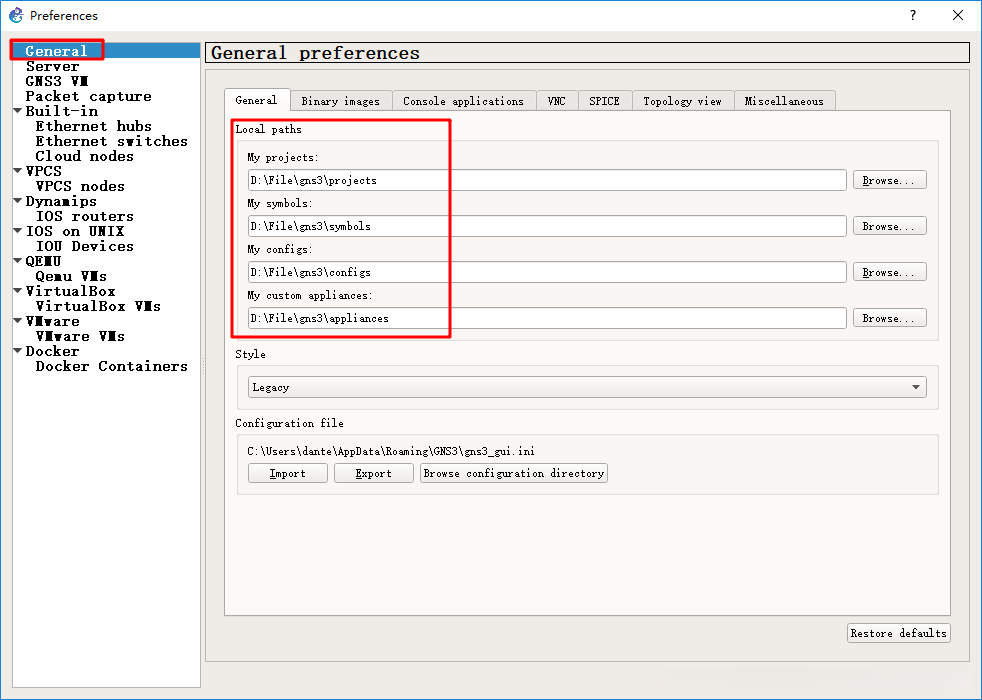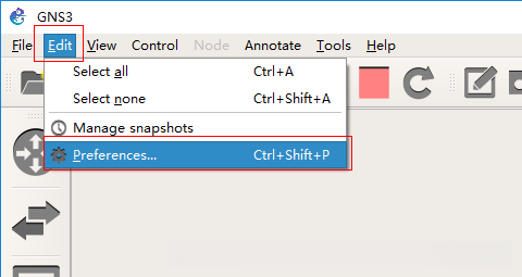 暂时不需要对GNS进行初始化。进入gns3后在进行更为详细的设置。选择Edit然后打开Preferences…进行详细设置。