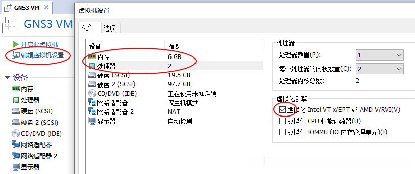 单击“编辑虚拟机设置”进行虚拟机的设置,主要是设置CPU和内存,CPU一定要开启虚拟化。内存根据个人计算机的内存分配。(我的笔记本内存是12G所以我给iou的内存为6G,如果电脑内存为4G建议IOU给2G就可以)