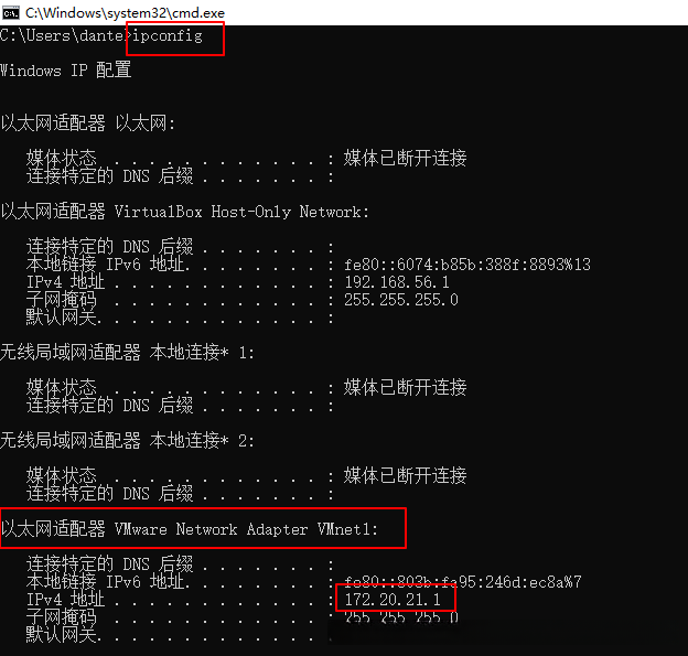 打开cmd命令行运行ipconfig命令查看”以太网适配器 VMware Network Adapter VMnet1:”的地址,设置与该网卡同一个段的的地址即可,但是网关要设置为X.X.X.2。