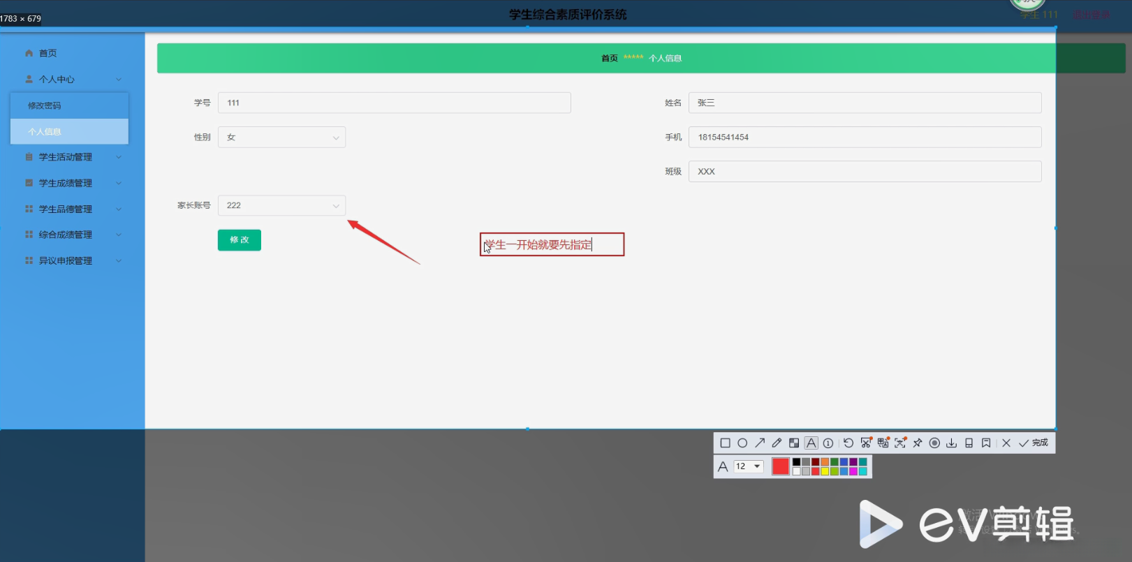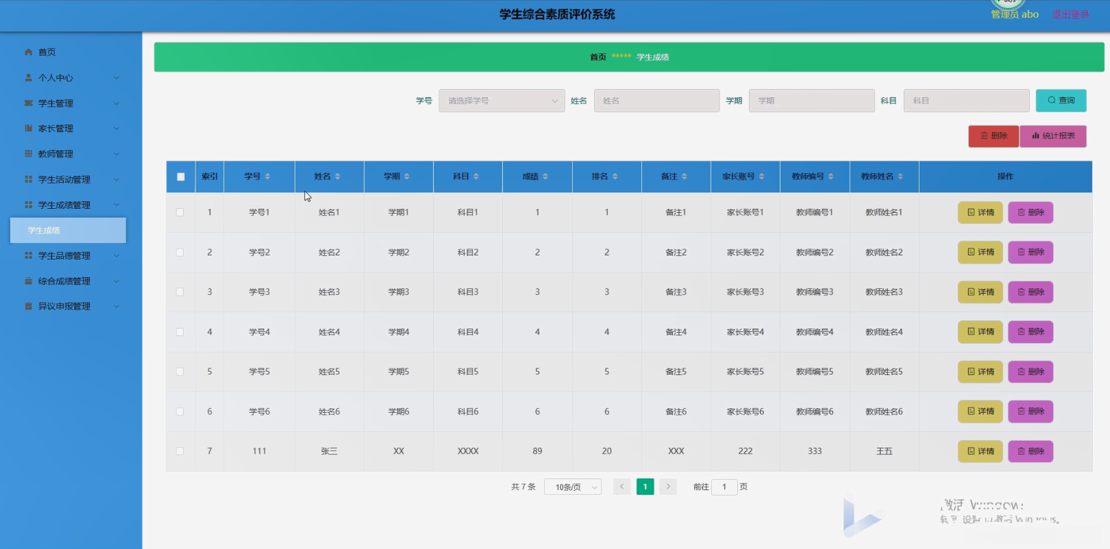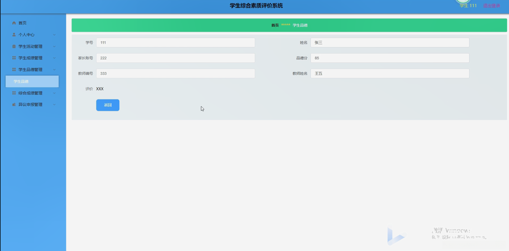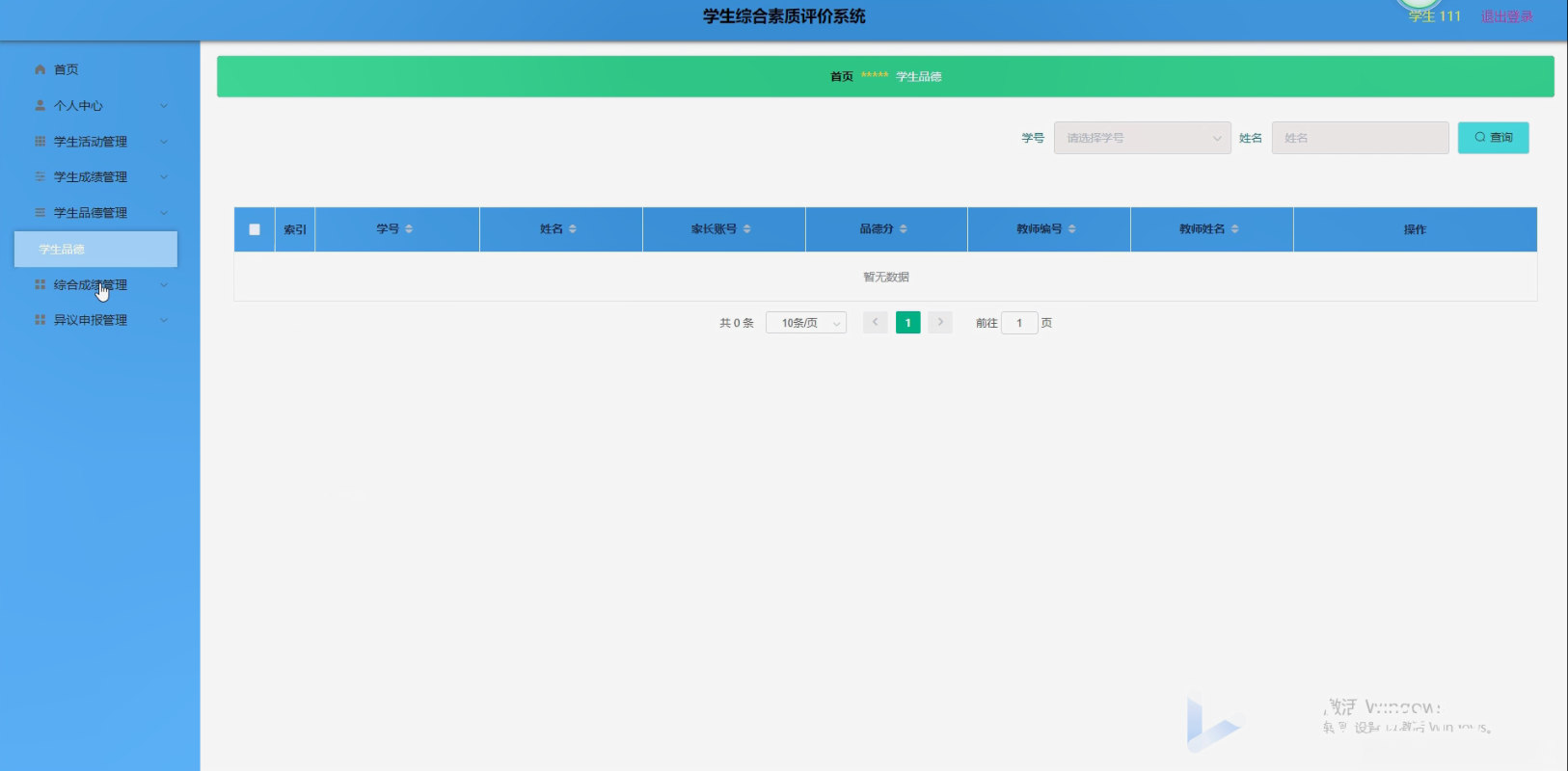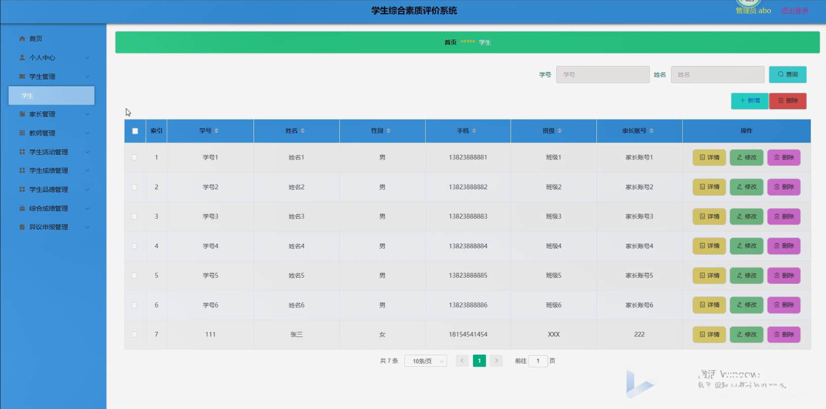 本研究将对学生的综合素质评价系统功能进行深入探讨,并主要涉及以下几个核心方面:一是学生信息管理;二是教师信息管理;三是学生活动管理;四是学生成绩管理;五是综合成绩计算;六是异议申报处理;七是学生品德评价;八是家长留言反馈;九是学生留言互动等。通过对其相关功能的深入研究与实践操作,并结合实际应用场景分析其数据特征与运行规律等特性,进一步探究该系统实现方式及其应用效果。同时,在这一过程中还将重点分析该系统的数据特征与运行规律等关键指标,并结合实际应用场景进行详细探讨。