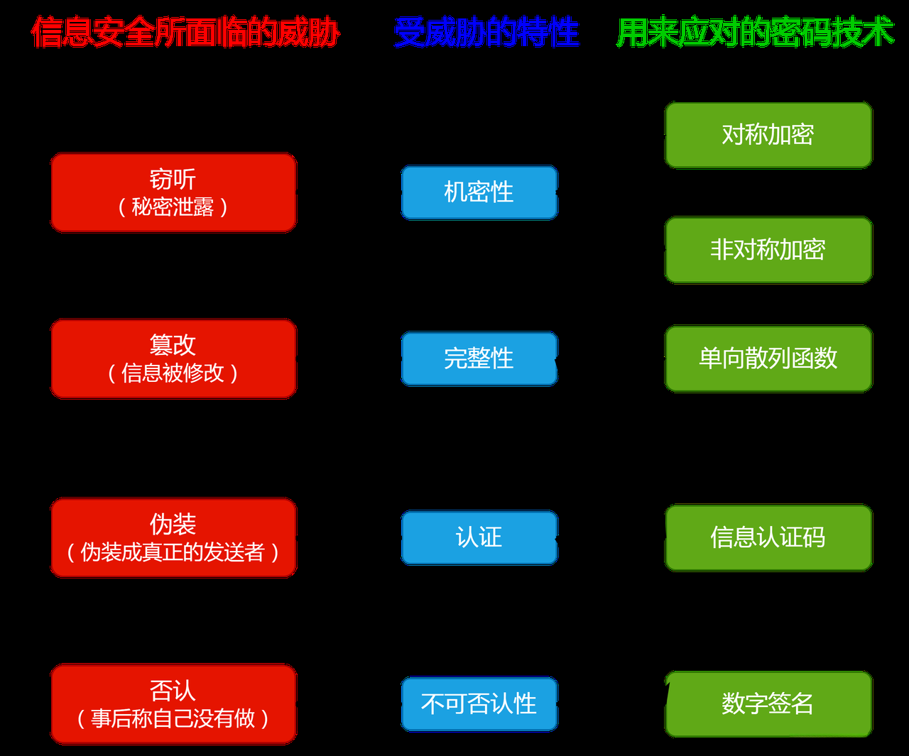 信息是当今社会的一种重要资源,信息产生利润、创造价值;现代信息系统要求必须有信息技术安全措施;信息加密是技术安全的主要措施之一。信息安全所面临的威胁与用来应对这些威胁的密码技术之间的关系如下图所示。