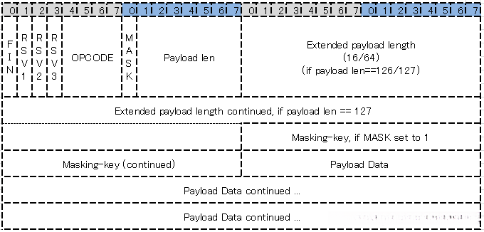 下面这幅图很好的说明了WebSocket 数据帧的格式,第一行代表数据大小,每一小格代表1bit单位。数据帧按照图中从左到右,从上到下的顺序排列。