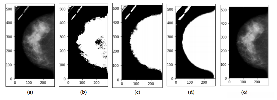 数据预处理,提取整个乳房感兴趣区域(ROI),并使用自定义内置图像处理技术去除不需要的信息。(a)原始乳房x线照片,(b)使用THRESH_OTSU算子生成的图像二值掩码,(c)使用THRESH_BINARY算子生成的图像二值掩码,(d)使用THRESH_TRIANGLE算子生成的图像二值掩码,以及(e)应用处理技术后对应的乳房图像
