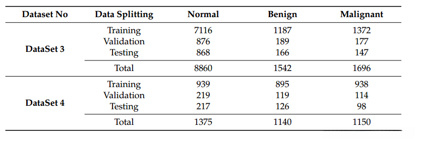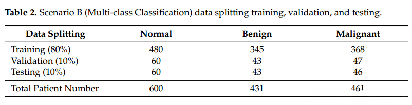 CBIS-DDSM数据集包含1566名患者的6671张乳房图像。实际上,CBIS-DDSM数据集是DDSM原始数据集的修改和标准化版本,仅包含异常病例(即良性和恶性),而原始DDSM数据集包含2620张扫描乳房x光片图像,包括正常、良性和恶性病例。在这项工作中,最终创建的数据集共有4091张乳房图像,包括从DDSM收集的正常病例和从CBIS-DDSM收集的异常病例。每个类别的图像总数定义为998个正常图像,461个良性图像和431个恶性图像。随机将生成的数据集分成80%用于训练,10%用于验证,10%用于测试。这些分割是分层的,以确保训练组、验证组和测试组在每个类中所占的比例相同。来自同一患者的不同MLO和CC视图保存在相同的训练、验证或测试集中,以避免任何准确性偏差并建立可靠的CAD系统。