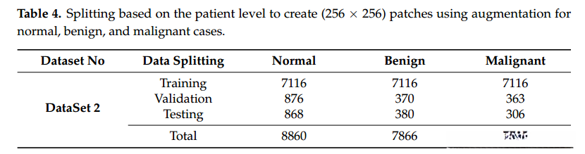 256 × 256的patch图像不足以区分良性和恶性病例,因为一些重要的特征在patch之间被划分。因此,对patch的创建进行了修改,创建了新的patch图像(400 × 400和512 × 512),而没有进行增强,增强会取到更大尺寸的良性和恶性特征,不同的是,可疑区域的ROI被分割成400 × 400或512 × 512的切片,而不是将每个区域分割成更小的补丁。表5总结了使用400 × 400和512 × 512补丁大小时新创建的数据集。提高了整体精度,特别是512 × 512补丁大小。