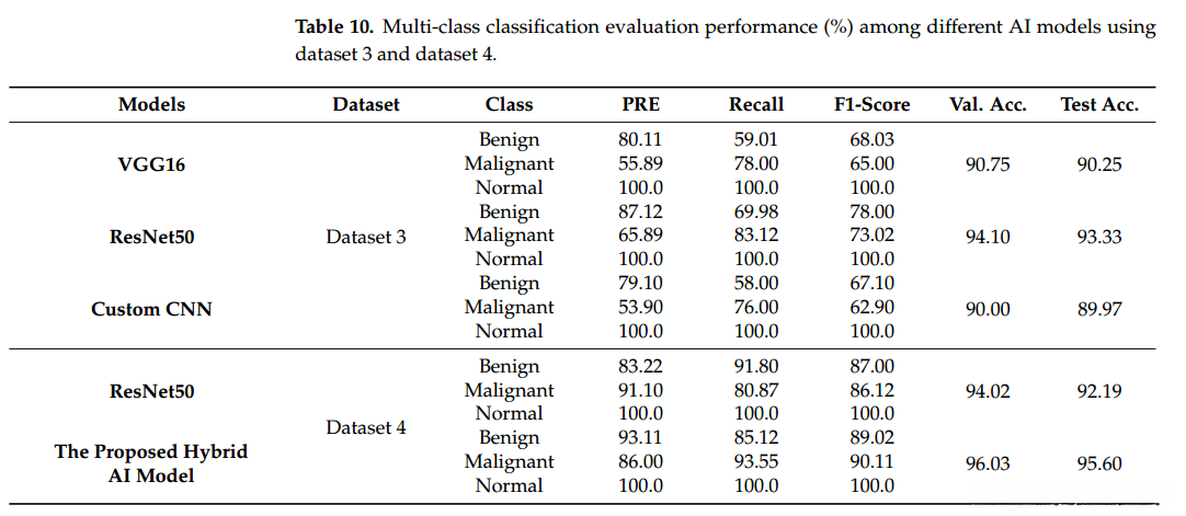 使用自定义CNN、VGG16和ResNet50三种AI模型与所提出的AI模型在二元和多类分类场景下的性能对比研究。
