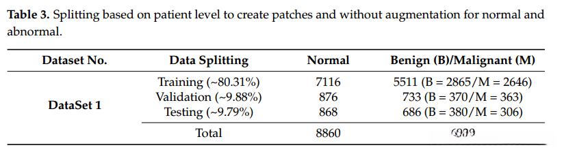 本研究考虑了所有在CBIS-DDSM数据集中有乳腺肿块的患者,而正常病例则从DDSM数据集中收集。针对场景A(二元分类问题)和场景B(多类分类问题),采用两种策略对生成的补丁进行分割。对于场景A(二元分类),生成的数据集如表1所示。