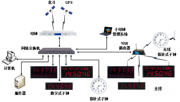 系统由母钟(带NTP网络服务器功能)、网络交换机、数字式子钟、子母钟管理系统等构成。母钟、网络交换机之间以有线网络连接;系统节点(母钟、网络交换机)与子钟之间可选网络UDP/IP或无线WIFI传输。子母钟管理系统通过网络,实现对系统节点与授时终端的参数设置、系统升级、开关控制、状态监测等功能。
