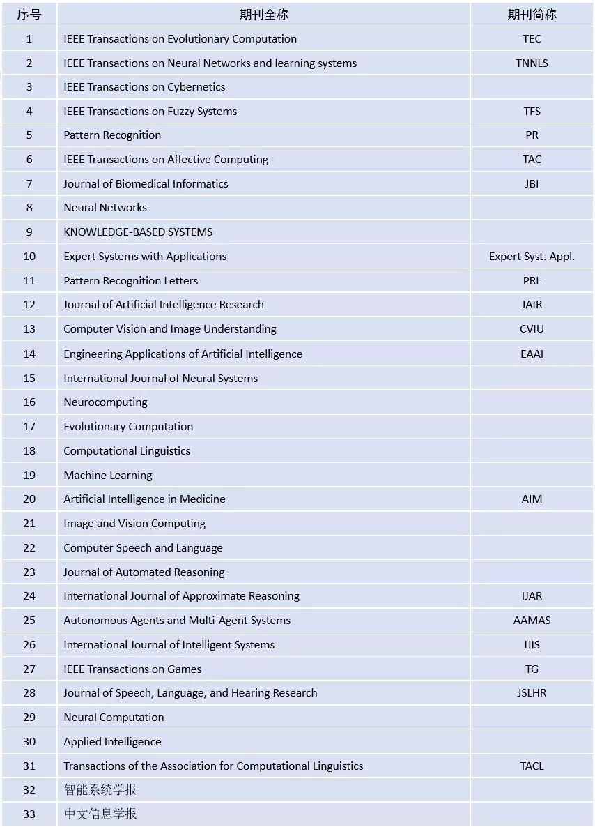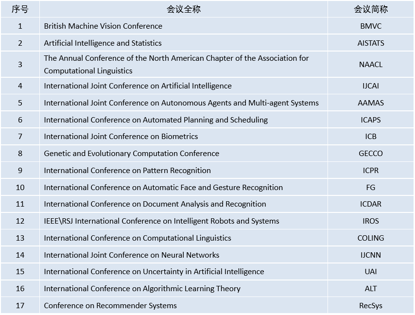 在人工智能与模式识别方向 ,清华推荐了12个A类会议,17个B类会议;A类期刊6个,B类期刊33个。