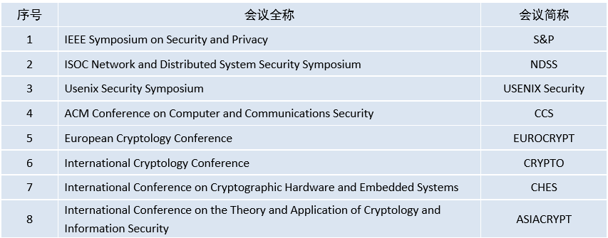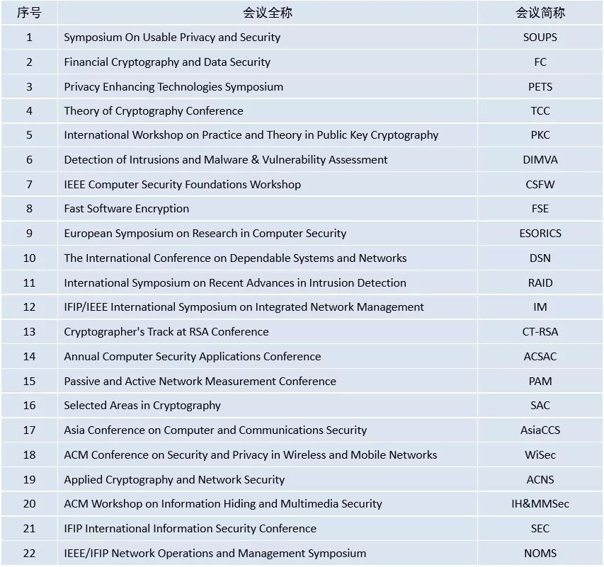 在网络与信息安全研究方向 ,清华推荐的A类会议8个,B类会议22个。A类期刊3个,B类期刊4个。