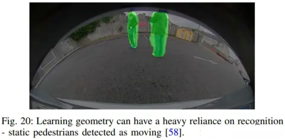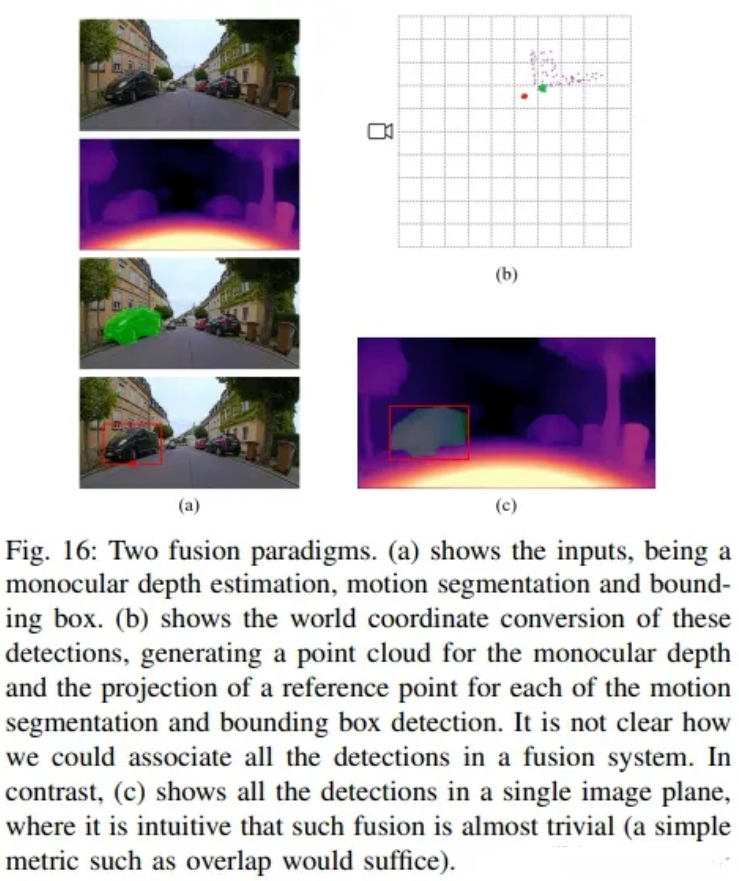 重组执行三个核心功能:1)实现识别与重建功能模块;2)利用相机将目标信息转换为世界坐标系中的数据;3)完成时空物体跟踪任务。值得注意的是,在视觉层面直接感知的目标信息可以直接输入到环境图中;但我们认为,在视觉层面进行融合整合具有显著优势。为了更好地理解这一优势,请考虑以下示例:如图16所示,在一个包含单目深度估计、运动分割与车辆检测系统的场景中,默认情况下各传感器数据如何处理?经典方法是将各传感器数据统一至同一坐标系进行关联与整合;这种方法具有显著优势:它能够有效提升系统的感知精度与可靠性。值得注意的是,在转换为欧氏空间图时,默认情况下基于相机检测的数据精度可能会受到影响;此外还需指出的是:图像域到世界域的映射存在多种潜在误差来源(包括但不限于校准不准、平面假设偏差、检测变化及像素密度分布不均等)。对于那些不在实际接触地面的关键点位置而言;这种基于平面假设的地图构建方式可能导致较大的定位误差。