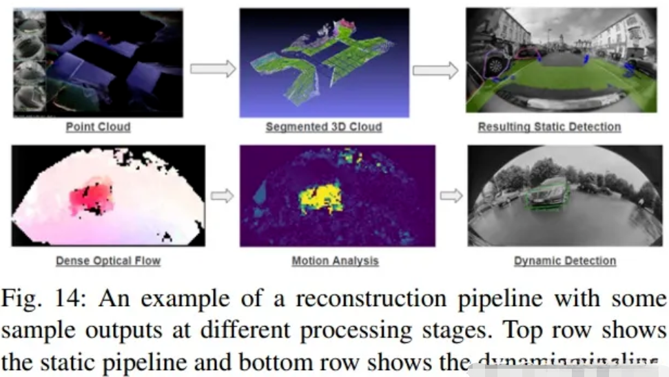 一般情况下, 运动分割的重要输入是关于摄像机运动的知识, 即需要知道相机的基本矩阵(或未校准情况下的基本矩阵)。参考文献[89]与[90]均基于这一前提, 并提供了两种实现方案: 首先, 可以直接利用车辆网络中的信息, 包括转向角与车轮转速等参数, 来估算车辆自身的运动会进而推断出摄像机的姿态; 或者也可以采用视觉手段从图像序列中推断出物体的运动会. 此外, 另一种途径是建立背景模型来分析. 其中一种建议是采用仿射模型来描述背景 motion这一假设认为背景平面远离观察者且径向变形可忽略. 图14展示了多个重建阶段的具体实例, 包括密集 motion 立体结构、三维点云以及静态障碍物集群等. 此外, 基于密集光流的方法也被广泛应用于 motion segmentation 的研究. 尽管鱼眼成像的应用会对系统性能产生一定影响但从理论层面而言这一问题仍需进一步探索.