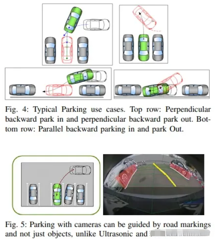 自动停车系统是短距离传感的重要应用案例之一,在图4中展示了多个典型的场景实例。早期商业半自动泊车技术主要依赖超声波传感器或雷达(Radar)进行操作。然而,在最近的发展中,全景摄像头已成为自动停车的重要传感器之一。超声波和毫米波雷达在自动停车中的主要局限在于它们仅能基于现有的障碍物来判断停车位是否合适(图5)。此外,在存在可辨别的停车标记(如施加涂层的线条)的情况下,环视相机系统则允许在这些条件下实现泊车,并被视为实现代客泊车系统的关键技术。