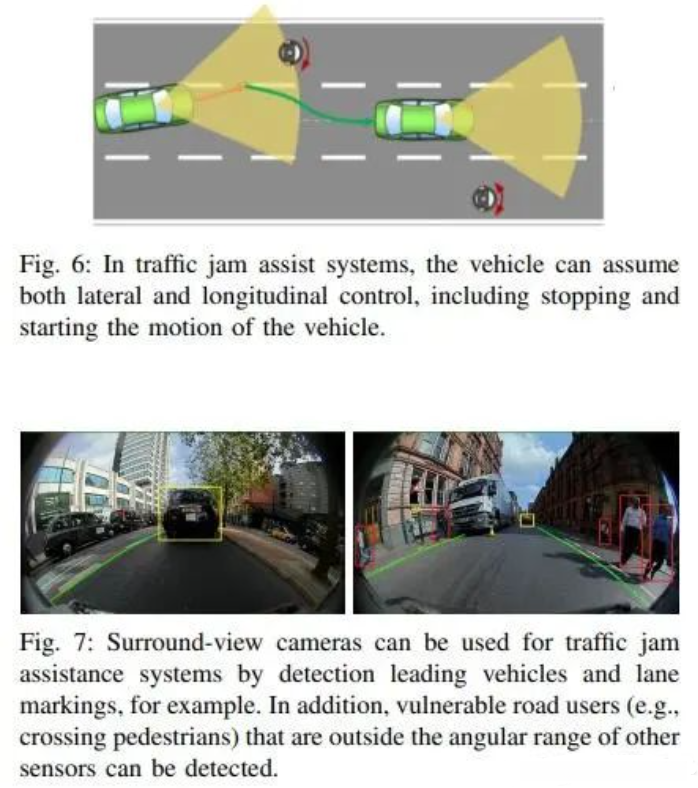 大多数事故多为低速追尾相撞,在当前驾驶技术中这一现象被认为是一个短期内可能带来好处的关键领域之一。尽管从短期来看它可能带来好处但系统的鲁棒性有待提升。在自动交通拥堵辅助系统中车辆能够在复杂路况下实现精准定位(图6)。该功能通常应用于低速环境其最大速度限制在60公里/小时但建议采用较低的速度上限40公里/小时以确保行车安全。然而,在城市交通中这一技术仍需探索因为其特殊的使用场景对视觉感知能力要求更高。基于此特点全景摄像头成为理想的选择尤其是在狭窄的城市道路环境中行人可以在传统前向摄像头或radar系统视野之外的区域安全穿过而无需依赖传统的视角限制。此外深度估计与SLAM等技术特征对于准确识别障碍物并维持车辆稳定行驶同样不可或缺(图7)。