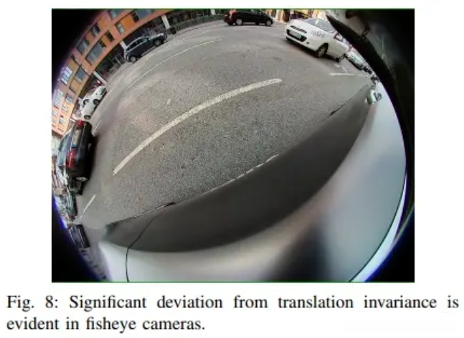 在标准视场相机中,直线投影与透视的原理极为相近,并具有的典型透视特征即现实世界中的直线在图像平面内呈现为直线。平行线组被映射为一组线条,在图像平面内汇聚于一个消失点;这些线条组分别对应于平行线群的实际走向方向。由于存在光学畸变的影响相对容易修正的特点,在许多应用场合下其处理方式较为简单可靠。然而,在实际应用中存在其他复杂因素的影响:例如,在本例中左侧车辆相对于右侧车辆旋转了近90度(相对于右侧车辆而言),这将直接影响目标检测卷积方法所依赖的前提条件——平移不变性这一假设是否成立:在标准相机配置下该假设是合理的;但在鱼眼成像系统中这一前提条件不再适用:如图8所示,在任何计算机视觉算法设计过程中必须充分考虑这一特殊现象的具体处理方式: