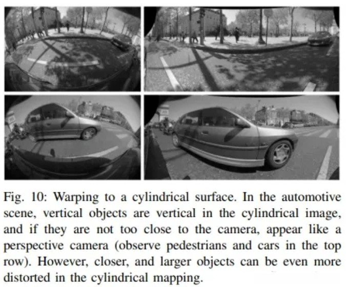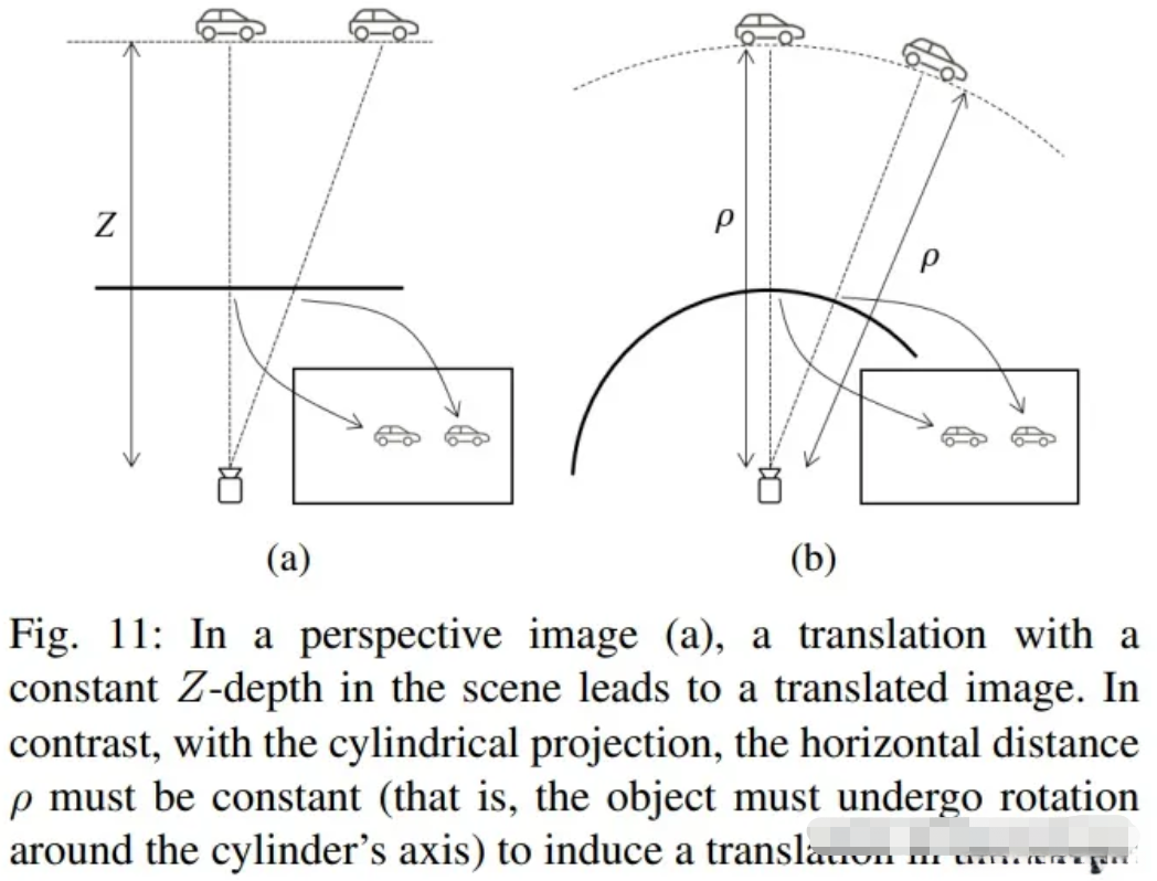 如图所示,在处理透视相机时(当物体与相机之间的Z轴距离保持恒定时),就会发生一次平移变换(即,在与图像平面平行的平面内)。然而,在圆柱面成像系统中(在同一水平面内移动的距离必须保持一致才能实现像素间的等距变换)。相比之下,在传统的鱼眼相机系统中(对于这种情况而言),尚不清楚任何特定类型的运动会导致像素间的等距变化。