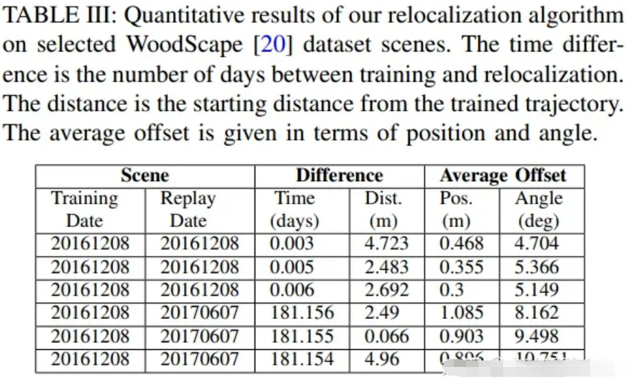 地点识别在Visual SLAM中有多个应用实例。首先,在同一场景中进行多次处理时会生成和维护地图。其次,在循环闭合过程中能够纠正累积漂移现象。尽管这些方法可能不够稳健。经过改进后的方法显示出了更好的稳定性,并且外观不变的方法在实验中表现出了令人鼓舞的初期效果[129]。此外,在特定时间点进行位置识别同样是一项关键任务。实验数据显示,在训练与定位之间相隔六个月的情况下出现的位置识别错误率显著上升。最后,请注意视图不变定位策略的应用情况:当重定位后的camera视点与训练时的角度差异较大时需要特别注意;例如由于车辆旋转而导致的问题传统基于特征描述符的方法难以应对此类情况。研究表明附加语义标签到场景地标(通过bounding box分类)能够显著提升这种定位策略的效果
