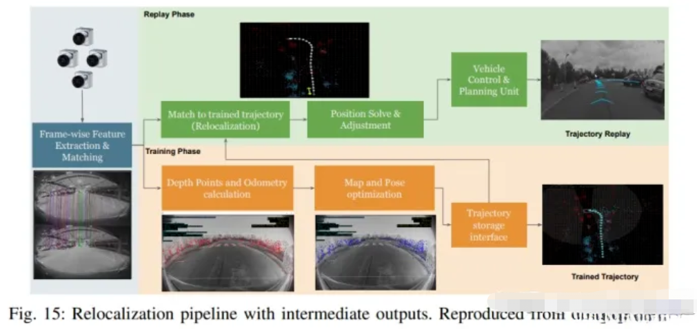 在自动驾驶视觉环境中,视觉SLAM(VSLAM)主要涉及绘制车辆周围环境的地图,并在此地图中估算车辆的当前位置。其中一项关键任务是利用之前记录的车辆定位轨迹。图15展示了基于特征的经典重定位流程。通过追踪技术可以确定这些地标的位置。第一步是识别出具有显著特性的区域。图像中的显著特征通常表现为特定的像素区域,在这种情况下其亮度变化遵循特定的空间模式。随后对这些关键点进行计算处理即可确定它们在真实世界中的坐标和姿态位置关系。随后将这些关键点存储起来作为参考数据以便后续定位使用。当车辆返回相同的一般位置时系统会自动调用实时检测功能与存储数据对比从而恢复当前的姿态信息