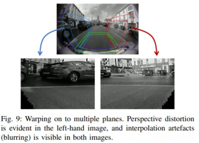 自然地解决这些问题的方法是通过某种方式进行图像校正。由于首先存在过多视野带来的损失问题以及插值和透视伪影的影响,在处理单个平面时难以保持鱼眼图像的独特优势。另一种常用的方法是采用多平面校正技术,在这种情况下,每个鱼眼图像的部分被扭曲成不同的平面。例如可以通过定义一个立方体并将其表面与鱼眼图像对应部分相匹配来实现扭曲效果。图9展示了这些变形区域的具体形态变化情况。即便如此,在处理这些复杂变形时仍然需要考虑插值和透视伪影的影响。