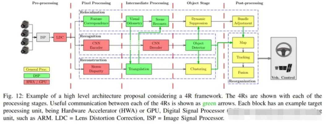 5) 后处理过程:最后一个主要的后处理阶段也可视为全局性处理环节,在时间和空间维度上实现数据持久化。由于支持长时间持续性和大规模的空间映射能力,前面各阶段的主要目标是降低到达这一环节的数据量,并确保所有用于车辆控制系统的关键信息得以保留。在此期间将执行一系列任务包括bundle adjustment的地图构建高级目标跟踪与预测以及多种计算机视觉输入的整合工作这些步骤均属于这一核心环节的一部分。考虑到系统中的推理层次处于较高水平并仅涉及最小的数据集从而通常配备有通用型数据处理器。