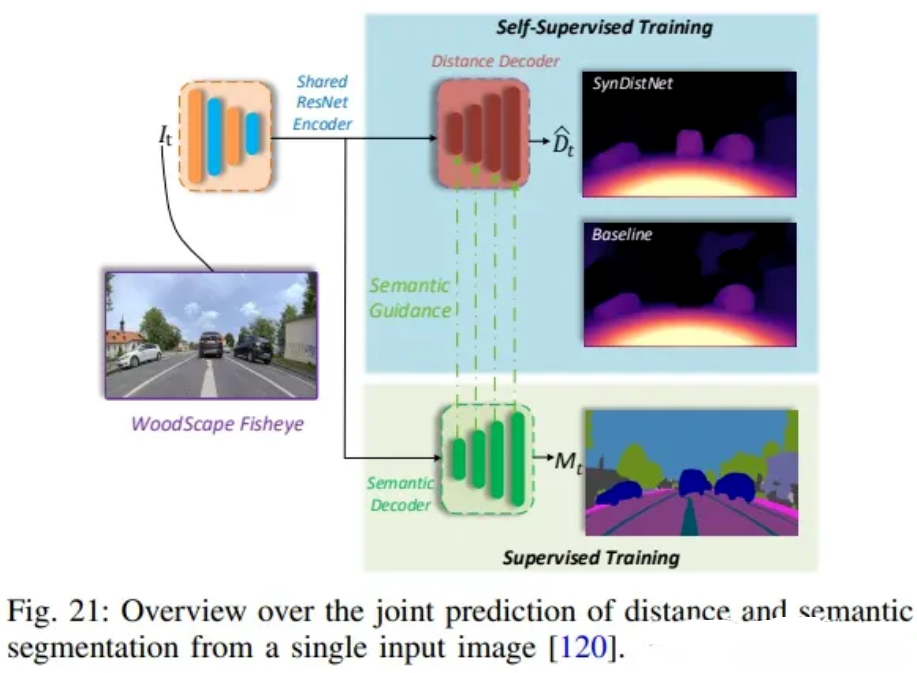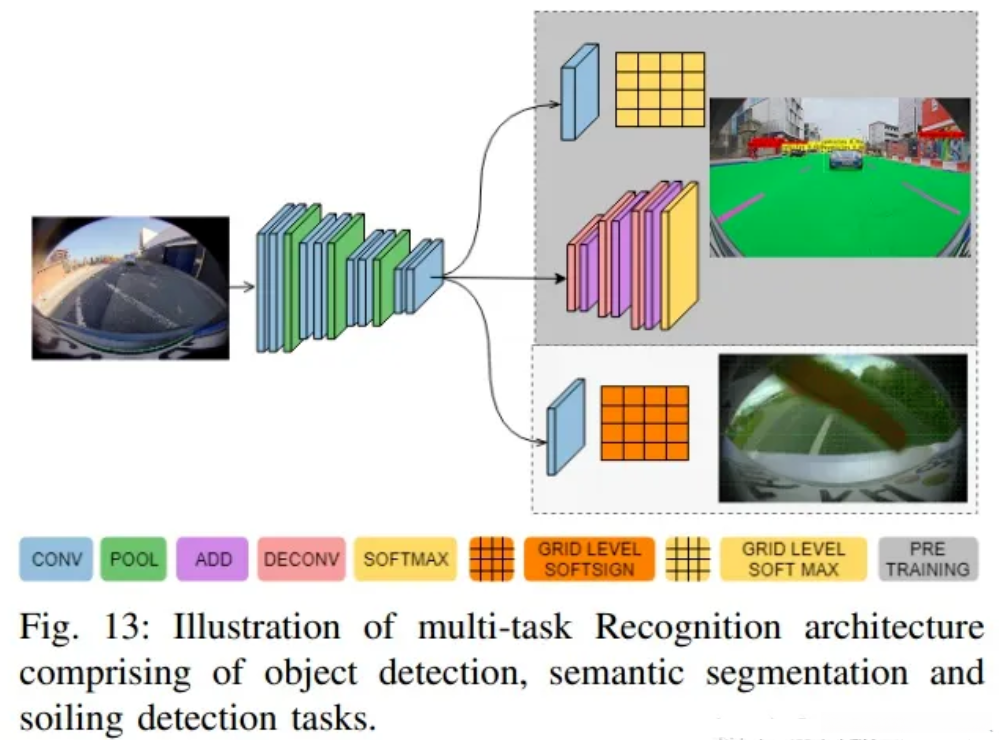 鱼眼摄像头被设置于车辆上相对较低的高度(约地面以上0.5至1.2米),容易受到其他车辆行驶时产生的道路喷雾或路面积水的影响而导致镜头受污。因此,在摄像头表面发现污垢变得至关重要,并会通过提醒驾驶员清洁摄像头或启动清洁系统来预防这种情况的发生。SoilingNet深入探讨了污垢检测任务及其在清洁系统和算法性能优化中的应用;与此直接相关的另一个任务是通过修复修复被污染区域的技术来去除污垢(但目前这些去污技术仍局限于视觉优化领域而非感知应用)。这是一个定义模糊的问题因为它无法预测遮挡物背后的情况(尽管借助时间信息可能会有所帮助)。由于低功耗汽车ECU的计算能力有限本文采用了多任务架构其中大部分计算资源在编码器中共享(如图13所示)。