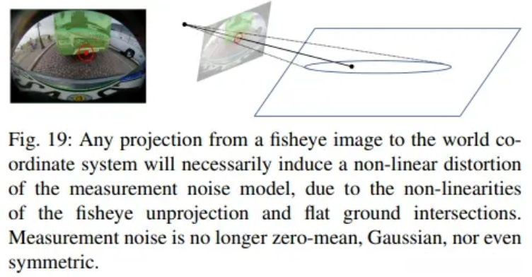 然而,在向世界投影之前,在图像域中进行检测时并不会受到此类错误的影响。这些视觉算法间的检测关联更加稳定,并且实际上发现简单的重叠机制往往表现出良好的稳定性。图18展示了基于CNN实现车辆检测与基于光流进行运动分割后基于图像进行融合的技术实现情况——尽管运动分割在精度上仍有提升空间,在融合过程中仍能有效地将目标分类为车辆或动态物体(如图19所示)。传统的融合与跟踪技术大多假设测量噪声服从高斯分布(即零均值假设)。但在计算机视觉领域中对感兴趣点进行测量时(如提取图像特征或确定边界框位置),这种假设通常是合理的——除非考虑了鱼眼畸变及其对测量噪声的影响(如图19所示)。此外,在考虑鱼眼畸变及其对测量噪声的影响时