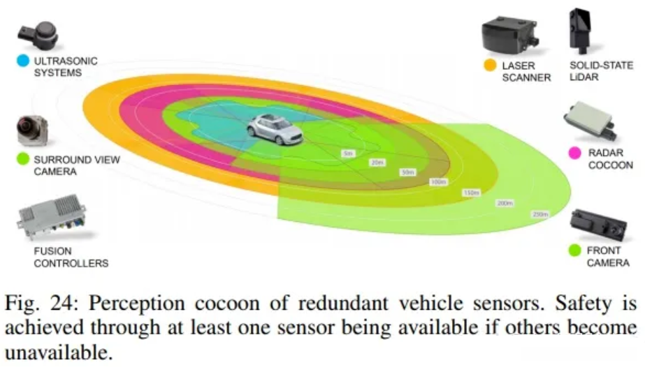 还有一个关键考量是冗余。在自动驾驶汽车领域中,在系统组件出现故障时必须配备备用组件以确保车辆安全运行至关重要。例如,FuseModNet展示了如何协调利用具有密集信息能力的相机与能够在低光照条件下有效工作的激光雷达技术以提升感知效果。在传感技术方面,这通常采用多种传感器组合来实现,具体包括计算机视觉系统、radar技术和激光雷达设备等,其中激光雷达因其高精度而成为主要应用之一。对于近场感知,超声波传感器阵列作为一种成熟且经济实惠的技术解决方案可在车辆周围提供强大的防护能力。
