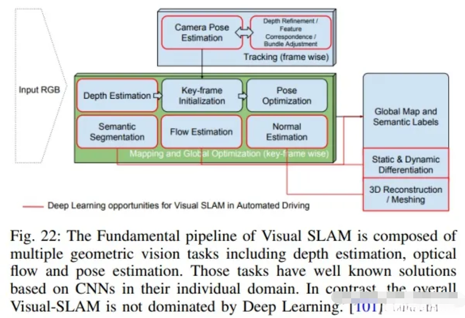 重定位与视觉SLAM常被视为场景重建(即构建地图)的过程,并借助Bundle Adjustment对这一地图进行逐步优化(见图15)。从而使得重建与视觉里程表构成了Visual SLAM的传统基础。存在一些直接的方法能够 bypass这一基础,并通过不同的优化策略实现更好的效果。例如LSD-SLAM及其适用于全向相机的扩展版本[100]中,在优化过程中将光度误差与重投影误差进行权衡。然而如果考虑Bundle Adjustment在时间切片上的应用,则可以看出 Visual SLAM 可用于优化场景结构与视觉里程计。此外动态目标的存在会严重影响基于此的技术。因此动态对象检测技术(如文献中的方法)可作为Visual SLAM管道的基础模块来减少由于运动物体引入的异常数据。