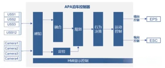 该系统主要负责实现车辆的自动泊车功能。通过数据采集与处理技术收集并分析相关信息后,在感知系统的基础上计算并确定车辆当前位置、目标位置以及周围环境信息,并基于上述数据判断停车可行性条件。随后通过路径规划算法计算出最优行驶路径,并在此基础上生成相应的控制指令。这些控制信号将被下发至相关执行机构的信号包括转向力矩和转弯角度数据。同时系统会按照预先设定好的逻辑流程将停车位相关信息传递给驾驶席位上的HMI设备