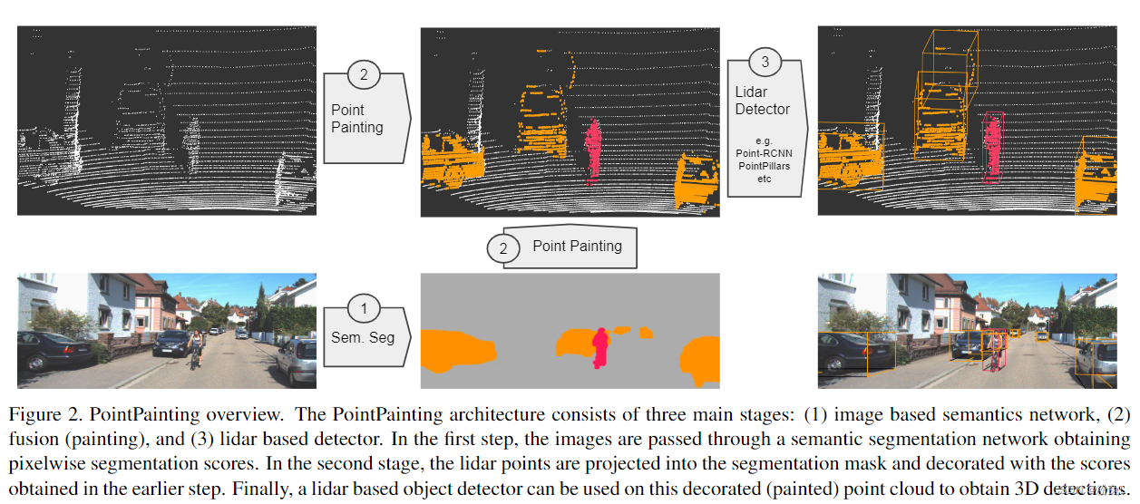 在weak fusion方法中,并非直接从多模态分支提取数据特征或对象进行融合操作。基于弱融合的方法通常会利用一种模态的数据来辅助另一种模态的分析或作为监督信号。具体而言,在文献[5]中提出了一种改进方案:首先利用语义分割网络对图像进行处理,并获取像素级别的置信度分数;随后将激光雷达生成的点云投影至分割图上,并依据置信度进行精炼和平滑处理;最后,在经过精炼和平滑处理后,激光雷达的目标探测器能够在此基础上实现三维空间的精确检测