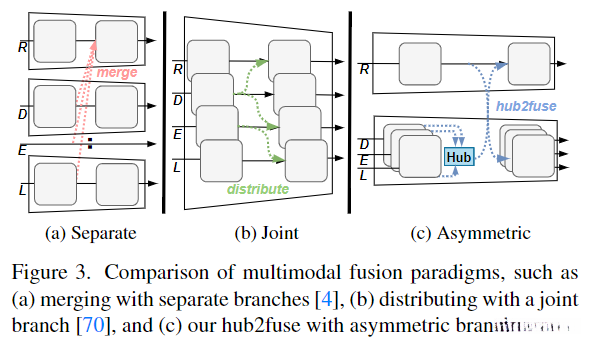 不对称融合 指的是两个模态分支在融合层级上存在差异的一种模式。如数据级与特征级之间、特征级与决策级之间的关系等。文献[4]提出了一种不对称双分支架构方案,在该架构中包含了一个RGB主分支以及一个整合多种数据模态的互补分支。其中RGB信息通过Transformer网络完成特征提取并实现增强作用;而另一支分则能够从多种输入中自动识别并筛选出具有有效性的信息内容,并在此基础上完成后续的融合工作。该方法主要得益于各模态间的互补特性,在极端天气环境下以及部分数据失效的情况下实现了有效的语义分割任务;同时该方案也具备良好的扩展性特点,并非局限于特定数量的数据类型组合