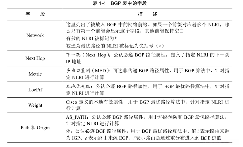 表 1-4 中描述了 BGP 表中展示的输出字段。