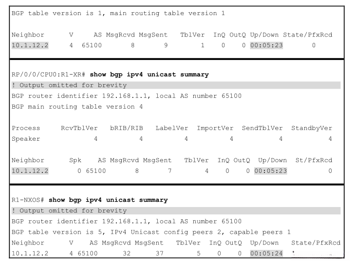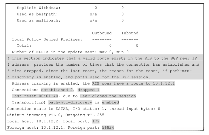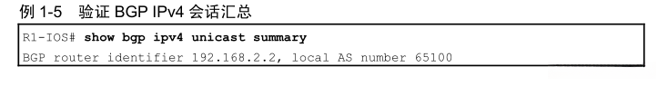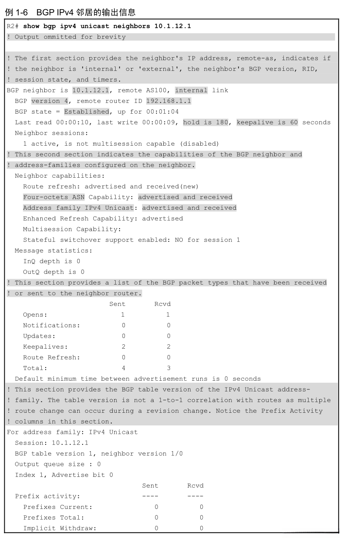 该命令会在 show bgp afi safi neighbors ip-address 中显示 BGP 邻居会话状态、计时器以及其他关键的数据信息,请参见示例 1-6