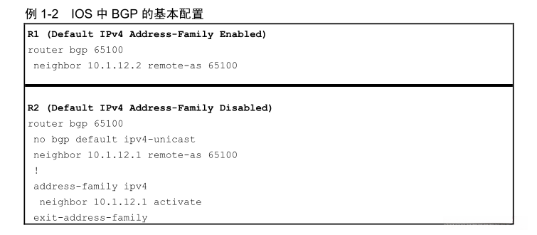 例 1-2 分别通过 R1 和 R2 展示了 IOS 的默认配置设置及其可选设置的变化情况(使用AFCI修饰符)。其中,在R1中,默认状态是启用了IPv4地址家族;而R2中则避免了默认启用一个IPv4地址家族,并由网络管理员手动启用了指定邻居(IP地址为10.1.12.1)的IPv4地址家族