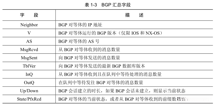 表 1-3 中列出了 BGP 表每一列的显示信息。